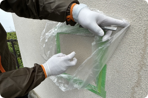 採取箇所のほこりを清掃後、ビニール袋等で周囲を囲い、養生テープで固定します。